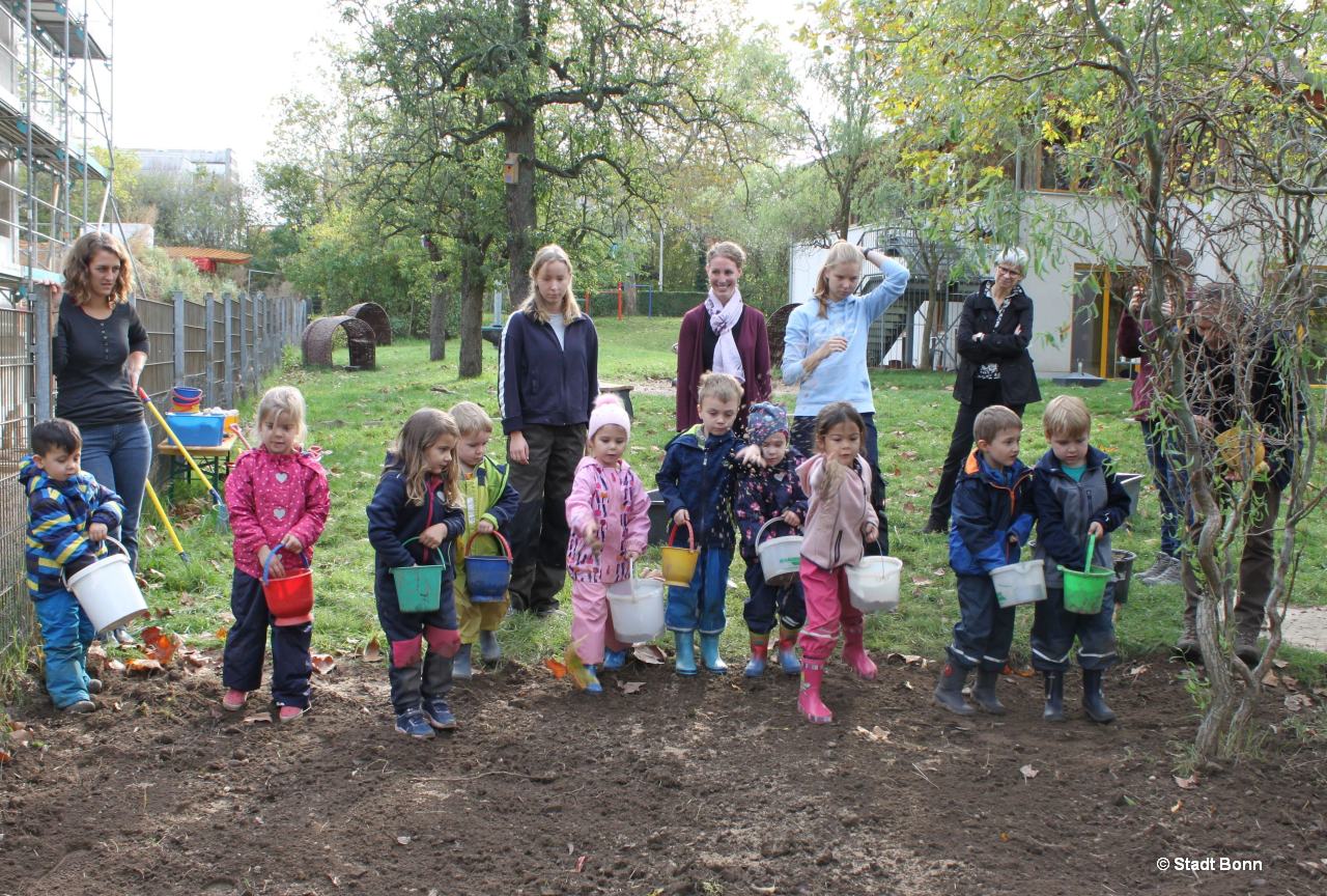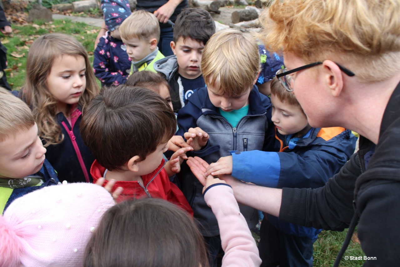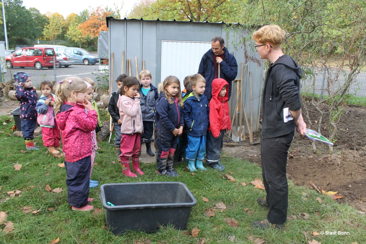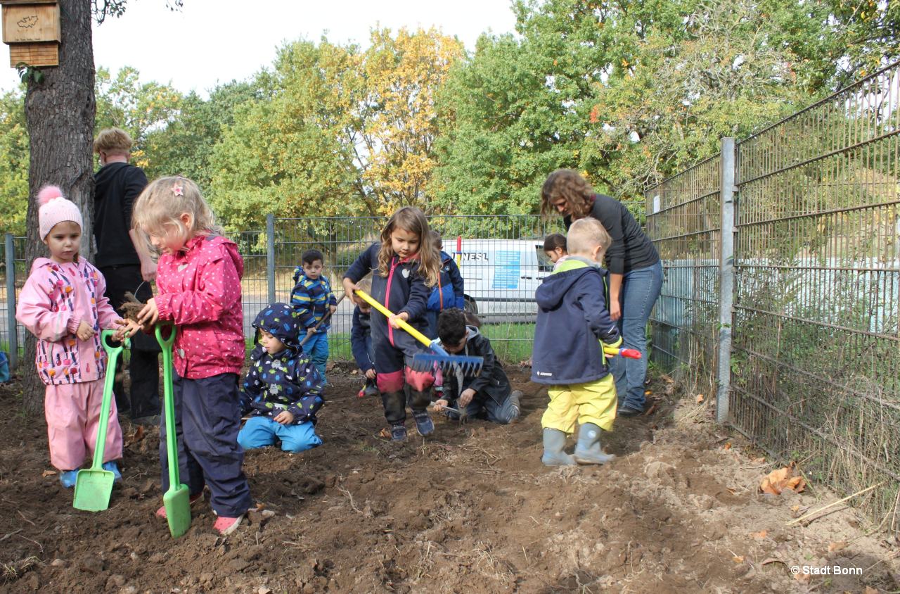 Die Untere Naturschutzbehörde (UNB) hat das Projekt „Blüten für Insekten - Beratung und Begleitung von Kindertageseinrichtungen bei der Anlage einer Blühwiese oder eines Blühbeetes“ initiiert. Damit Insekten in der Stadt auch in Zukunft noch genügend Nahrung und Brutplätze finden, haben Kinder aus 5 Bonner Kindergärten Blühflächen in den Einrichtungen angelegt. Hier wachsen im Sommer heimische Blühpflanzen und bieten Lebensräume für Wildbienen, Hummeln und Co. Fachlich eng begleitet werden die Kitas dabei von der Biologischen Station Bonn. Ziel ist es, den Schutz und die Förderung von Wildbienen und anderen Insekten für Kinder in den Fokus zu rücken, sie dafür zu begeistern und ein Bewusstsein und eine Wertschätzung für Insekten zu schaffen. Die Kinder erfahren praxisnah die große Vielfalt der Pflanzen- und Tierwelt und deren Zusammenhänge, so dass der kindliche Forschergeist geweckt wird. Gemeinsam mit der UNB und den MitarbeiterInnen der Biologischen Station suchten die Kinder bei den Aussaataktionen eine geeignete Fläche für die Blühwiese aus und säten Kornblumen, Margeriten, Klatsch-Mohn und weitere insektenfreundliche Pflanzen einer mehrjährigen Regio-Saatgutmischung aus. Bis die Beete im Frühsommer blühen, sind mehrere Beratungstermine geplant: Während der gesamten Aufwuchs- und Blühphase wird die Biologische Station die Kitas, im engen Austausch mit der UNB, begleiten und beraten.Da das Projekt sehr gut gestartet ist, plant die UNB im Jahr 2020 die Fortsetzung.
