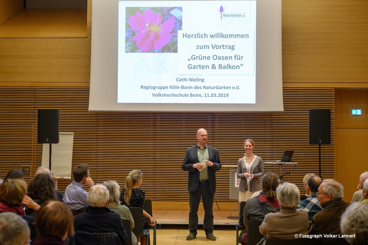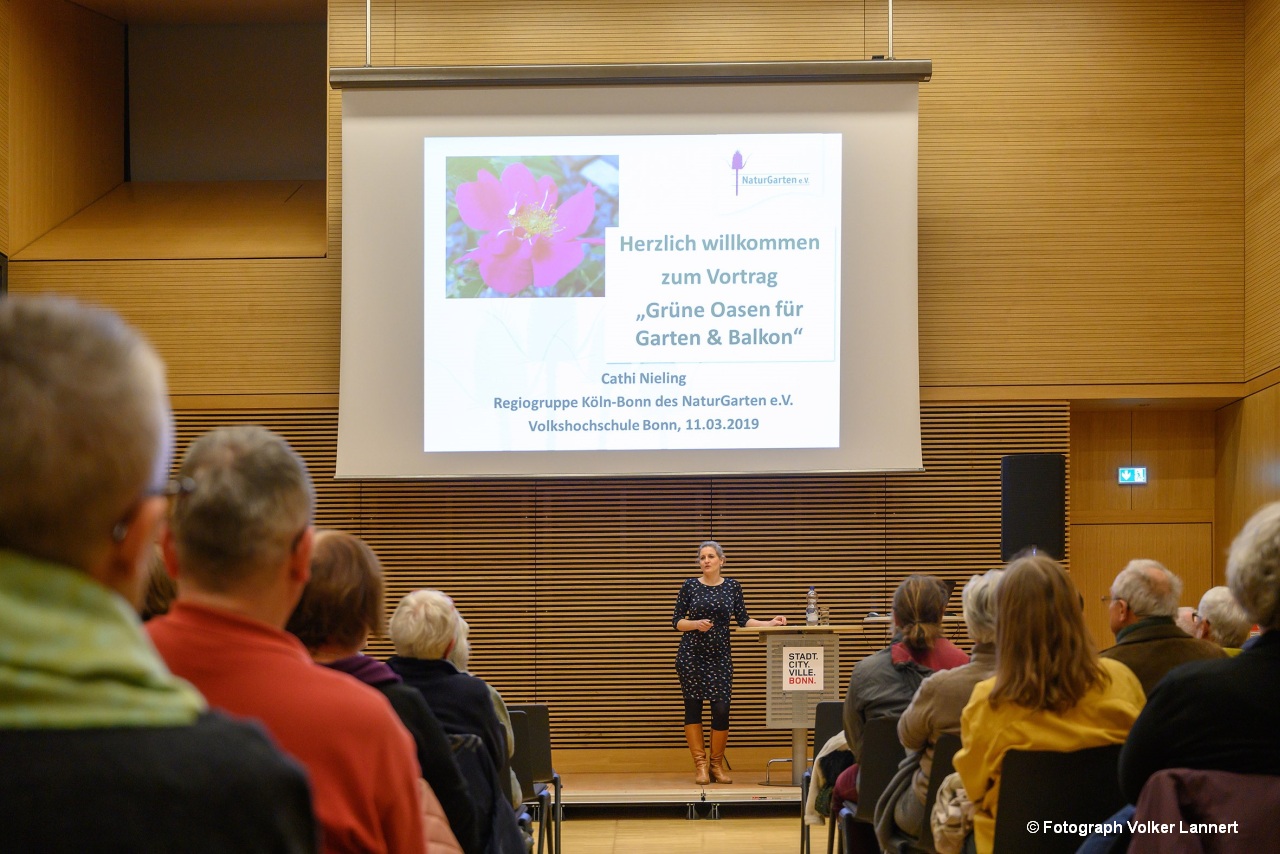 Daher hat sie in enger Zusammenarbeit mit der Volkshochschule der Stadt Bonn die Veranstaltungsreihe "Biologische Vielfalt in der Stadt" initiiert. Hier erhalten Interessierte praxisnahe Informationen und konkrete Tipps, um in ihren Gärten, Vorgärten und selbst auf Balkonen kleine Biotope für heimische Pflanzen und Tiere zu erschaffen.