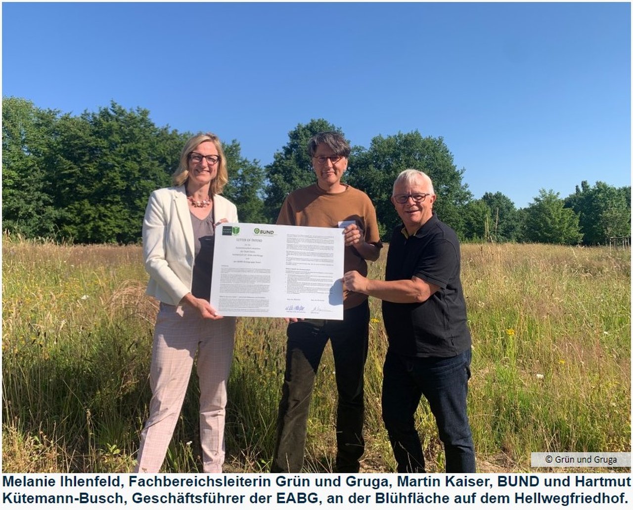Die BUND KG Essen und der Fachbereich 67, Grün und Gruga der Stadt Essen (GGE), pflegen in den Belangen des Artenschutzes und des Erhalts der Biodiversität eine enge und von gegenseitigem Vertrauen und Respekt geprägte Zusammenarbeit. Die wichtigsten Eckpfeiler der Zusammenarbeit stellen der regelmäßige Austausch zu gemeinsamen Maßnahmen sowie eine abgestimmte Kommunikation nach außen sowohl im Hinblick auf mediale Veröffentlichungen als auch hinsichtlich der Kommunikation und dem Wissenstransfer mit der Stadtgesellschaft dar. Unter dem Motto "Wild ist das neue Schön" wurde jetzt ein Letter of Intend aufgesetzt, um die Zusammenarbeit beider Partner auch schriftlich zu fixieren. Erste gemeinsame Maßnahmen, dem Verlust von Biodiversität entgegenzuwirken, sind bereits auf brachgefallenen und intensiv gepflegten Friedhofsflächen umgesetzt worden. Durch die veränderte Bestattungskultur, von Erd-zu Urnenbestattungen, haben Friedhöfe ein besonders großes Flächenpotenzial. Das Hauptaugenmerk liegt dabei auf der Aufwertung von Offenlandflächen. Dazu wird Regiosaatgut eingebracht und die Flächen anschließend fachgerecht gepflegt (Extensivierung). Die Maßnahmen werden durch das Aufstellen von Lern- und Infotafeln erläutert. Wo möglich, soll sich die Zusammenarbeit auch auf weitere Grünflächen außerhalb von Friedhöfen erstrecken. Der BUND und Grün und Gruga möchten sich auch bei der Durchführung von Veranstaltungen und der Veröffentlichung von Publikationen gegenseitig unterstützen.