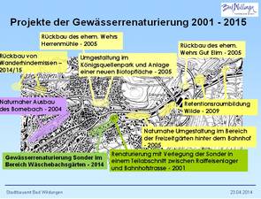 Bereits im Vorfeld der 3. Hessischen Landesgartenschau, die in Bad Wildungen im Jahre 2006 stattfand, wurde mit der Umsetzung eines breit angelegten, innerstädtischen Gewässer-Renaturierungsprogrammes begonnen. Der Bachlauf "Wilde", der von der Quelle bis zur Mündung nach circa zwölf Kilometer komplett das Bad Wildunger Stadtgebiet durchfließt wurde und wird von zahlreichen Ufer-Verbauungen befreit. Neuer Retentionsraum mit naturnah ausgebildten Flutmulden wurde geschaffen, ehemalige Wehre wurden rückgebaut, um die Wanderungsmöglichkeiten von amphibischen Lebewesen zu optimieren. Auch die wichtigsten Zuflüsse "Sonderbach" und "Bornebach" wurden in dieses gesamte Gewässerökologie-Projekt einbezogen.