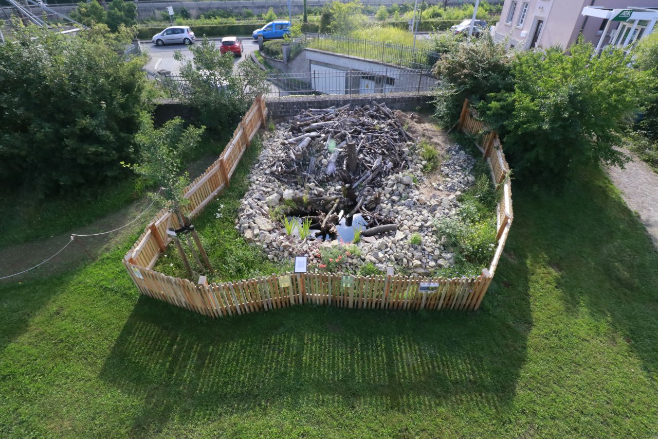 Im Grüngürtel der Stadt Karlstadt wurde ein strukturreiches Biotop gebaut. Der Platz wurde gewählt weil in diesem Bereich ein stark frequentierter Weg zum nahen Kindergarten liegt sowie sich in unmittelbarer Nähe ein Spielplatz befindet. Hier können sich große und kleine Entdecker Ideen holen sowie das, mittlerweile sehr rege, Treiben von Insekten und Vögeln beobachten. Das verwendete Material stammt ausnahmslos "aus der Region, für die Region". So wurde Totholz von nötigen Baumfällungen im Stadtgebiet sowie Muschelkalk von Lesesteinhaufen verwendet. Auf ca. 100 m² wurde das Biotop, bestehend aus Totholzstrukturen für Insekten und kleine Säuger, Steinriegel und kleinere Trockenmauerabschnitte, eine offene Sandfläche für "bodenständige" Insekten sowie ein kleines Feuchtbiotop für Insekten und Amphibien, gebaut. In unmittelbarer Nähe befindet sich eine etablierte Blühfläche. Zudem wurde im anliegenden Bereich noch ein Saumstreifen mit ausschließlich heimischen Kräutern angesät. Der umgebende Zaun wurde aus Holz vom stadteigenen Wald durch die Schreiner des Bauhofes gefertigt.