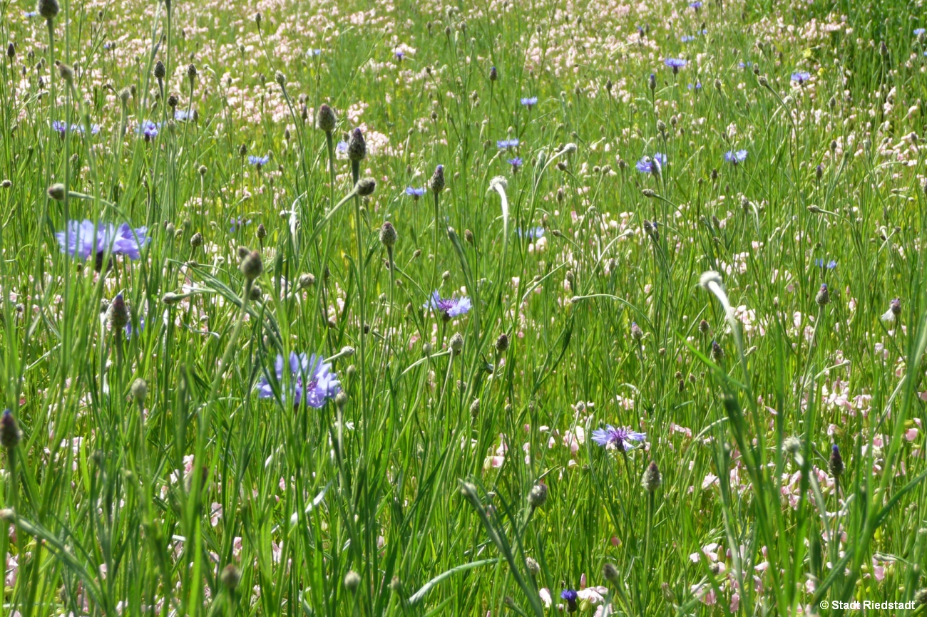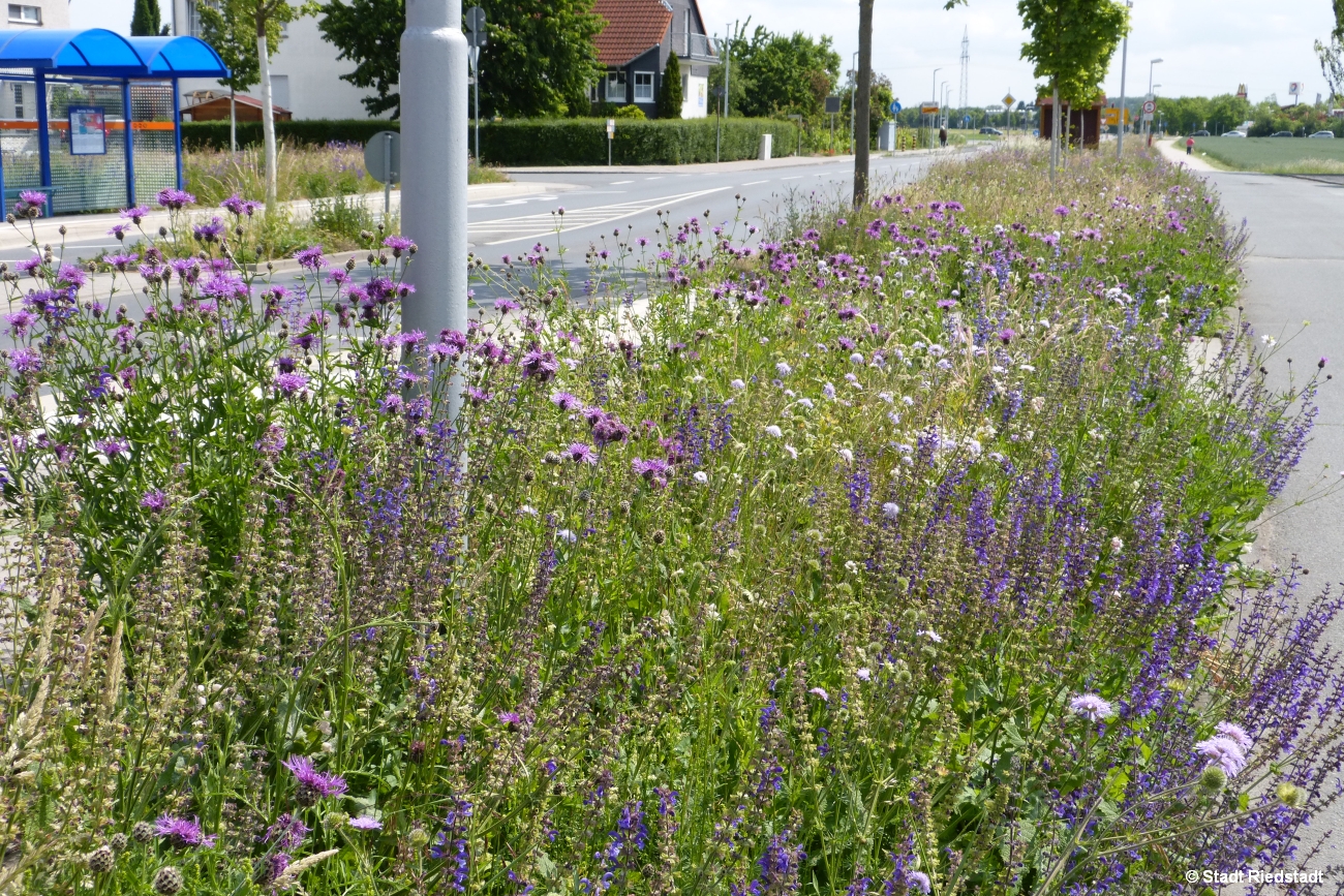 Ende 2009 wurde in Riedstadt mit einer weitgehenden Umgestaltung der innerstädtischen Grünflächen begonnen. Um eine größere Artenvielfalt zu erreichen, wurde auf den Flächen der vorhandene Boden bis in 50 Zentimeter Tiefe entfernt und durch ein speziell für den innerstädtischen Bereich entwickeltes, nährstoffarmes Substrat ersetzt. Anschließend wurde eine eigene Wiesenblumenmischung entwickelt und eingesät, die an das trocken-warme Riedstädter Klima angepasst ist und circa 100 Arten aus zertifiziert regionaler Herkunft enthält.