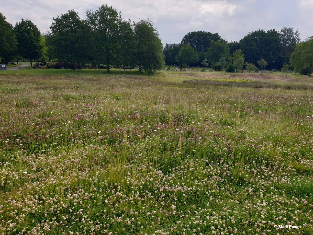 Auf dem Friedhof Am Hellweg wurden auf 10.000 m² artenreiche Wiesen angelegt. Ursprünglich durch eine extensive Grünlandbewirtschaftung entstanden, bieten diese Vegetationsstrukturen einen wichtigen Lebensraum für viele heimische Tierarten, die auf landwirtschaftlich intensiv genutzten Flächen nicht mehr überleben können. Bei der Anlage der Wiesen und Aufbereitung der Böden wurden verschiedene Vorgehensweisen angewandt, um später die Methode mit bestem Kosten-Nutzen-Aufwand zu eruieren. Genutzt wurde ausschließlich Regiosaatgut, das sich zu 70 % aus Gräsern und zu 30 % aus Kräutern zusammensetzt. Gepflegt werden die Wiesen durch eine ein- bis zweimalige Mahd pro Jahr mit - und das ist von großer Bedeutung - Abfuhr des Schnittgutes (Heu). Als Ergänzung des Lebensraums Wiese wurde auch die Geländeoberfläche kleinräumig neu modelliert. So sind Retentionssenken und Versickerungsmulden entstanden, die die anfallenden Niederschläge vom Friedhof und seiner Umgebung auffangen. Der Friedhof konnte dadurch in großen Bereichen vom Kanalnetz abgekoppelt werden. Die Niederschläge versickern nun vor Ort, stärken den lokalen Wasserkreislauf und sind pflanzenverfügbar. Gleichzeitig sind dauerhafte und temporäre Stillgewässer entstanden, die Lebensräume für wassergebundene Tier- und Pflanzenarten bilden. Die Flächenentwicklung unterliegt einem Monitoring der Stadt Essen und der Biologischen Station Westliches Ruhrgebiet (BSWR).