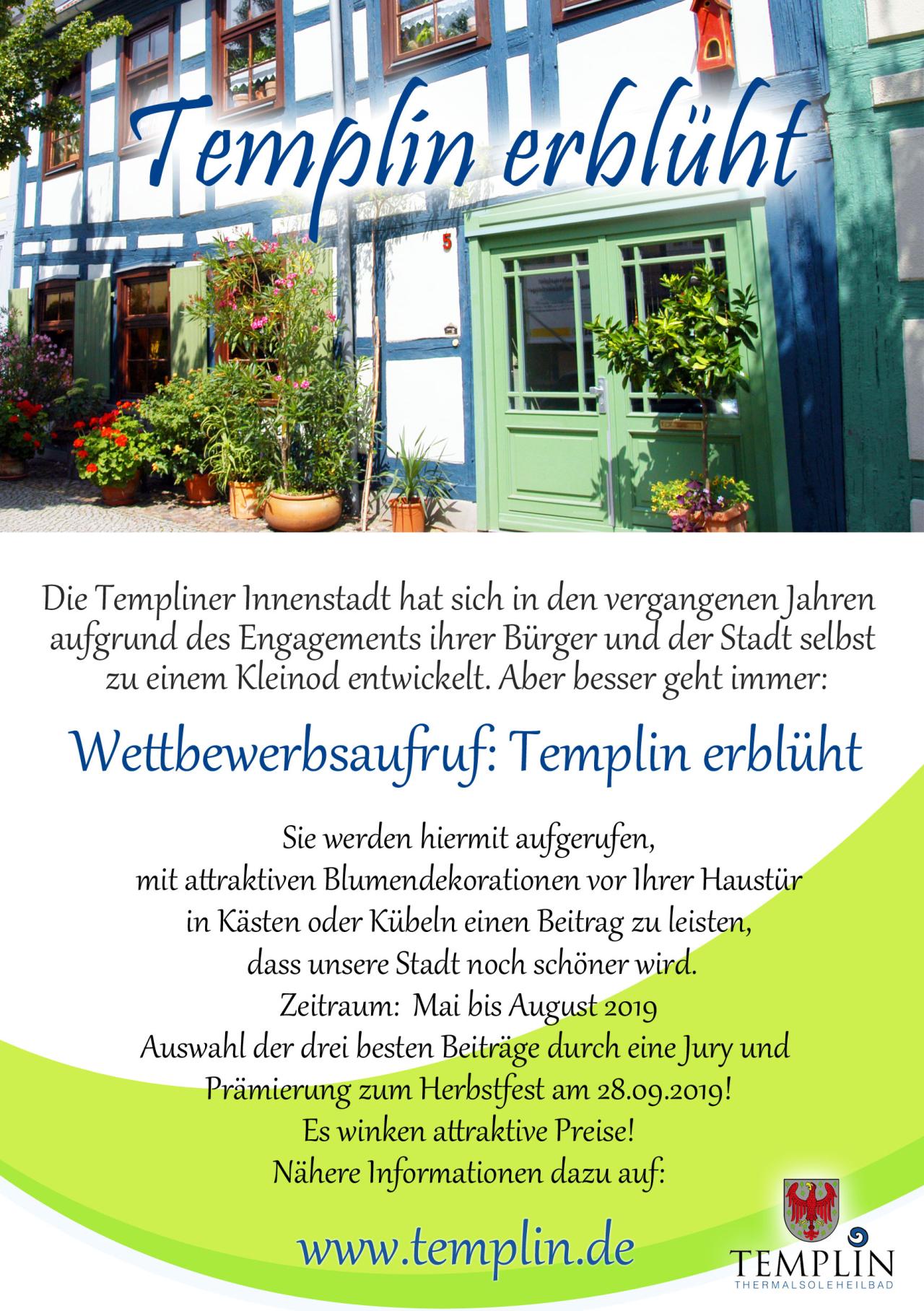 Zwischen Mai und August 2019 waren die Templiner aufgerufen, mit attraktiven Blumendekorationen vor ihrer Haustür in Kästen oder Kübeln einen Beitrag zu leisten, ihre Stadt zu begrünen. Die drei besten Beiträge wurden nach einer Begehung durch eine Jury ausgewählt und im Rahmen des Herbstfestes am 28.09.2019 auf dem Marktplatz prämiert! Kriterien wie Insektenfreundlichkeit, Harmonie und Gesamtbild oder Blütenvielfalt flossen in die Bewertung der 24 Beiträge mit ein.